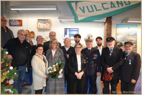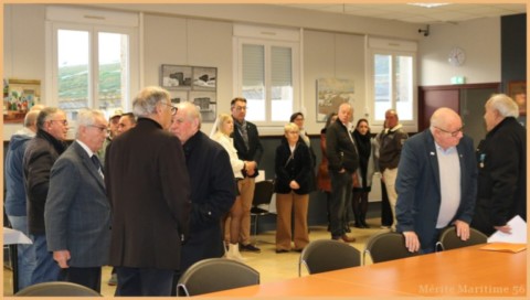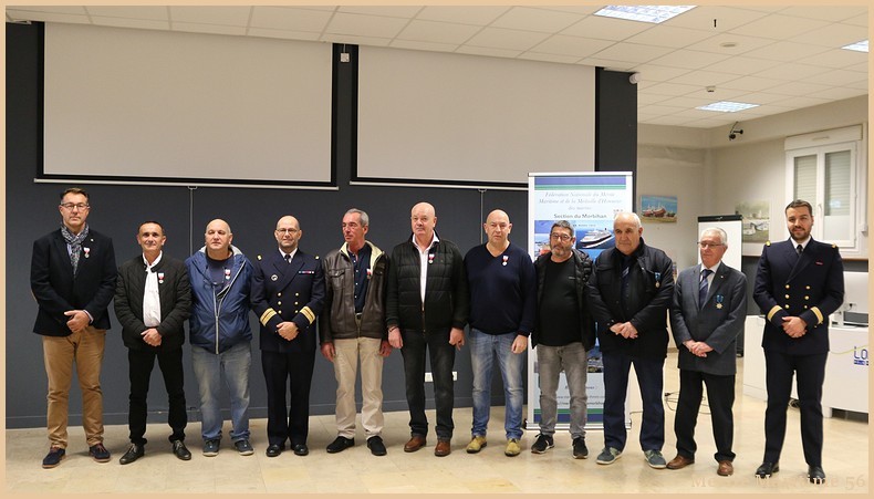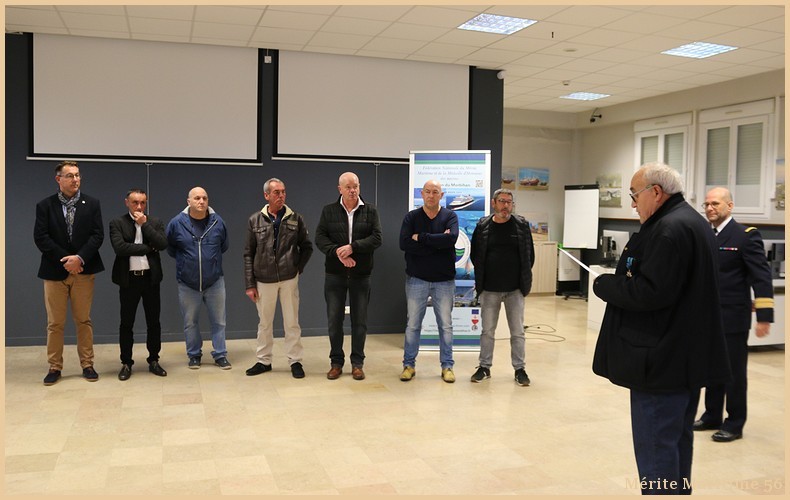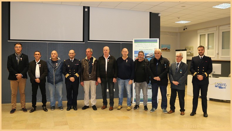 Sept marins présents sur les 24 marins nommés en 2025 ont reçu la Médaille d'Honneur par Mr Le Mentec (Directeur adjoint de Direction Départementale des Territoires et de la Mer en collaboration) en présence de Mr Le Falher Guy (président de la section du Mérite Maritime du Morbihan, Mr Cantaloube Serge (président des pensionnés de la Marine Marchande du Morbihan) Mr Anne Valentin (Directeur assistant de la DDTM 56 à Lorient) ainsi que plusieurs membres de notre association .